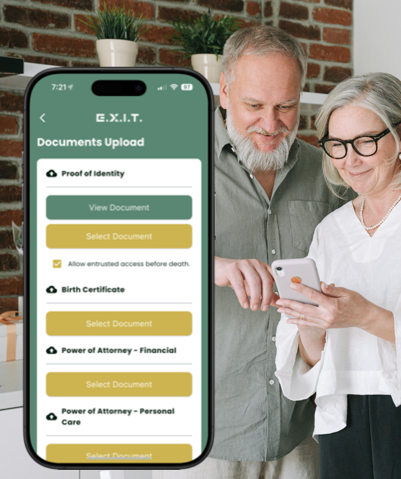 Yes — the EXIT Life Ready App provides a secure digital vault for legal documents, making it easy to store important files such as wills, powers of attorney, and other critical legal records. The app lets you safely upload and organize these documents in one protected place, ensuring they are available, clearly labelled, and easy to find when they’re needed most. This secure digital vault for legal documents gives you and your loved ones peace of mind knowing that essential information is stored safely and ready to access.