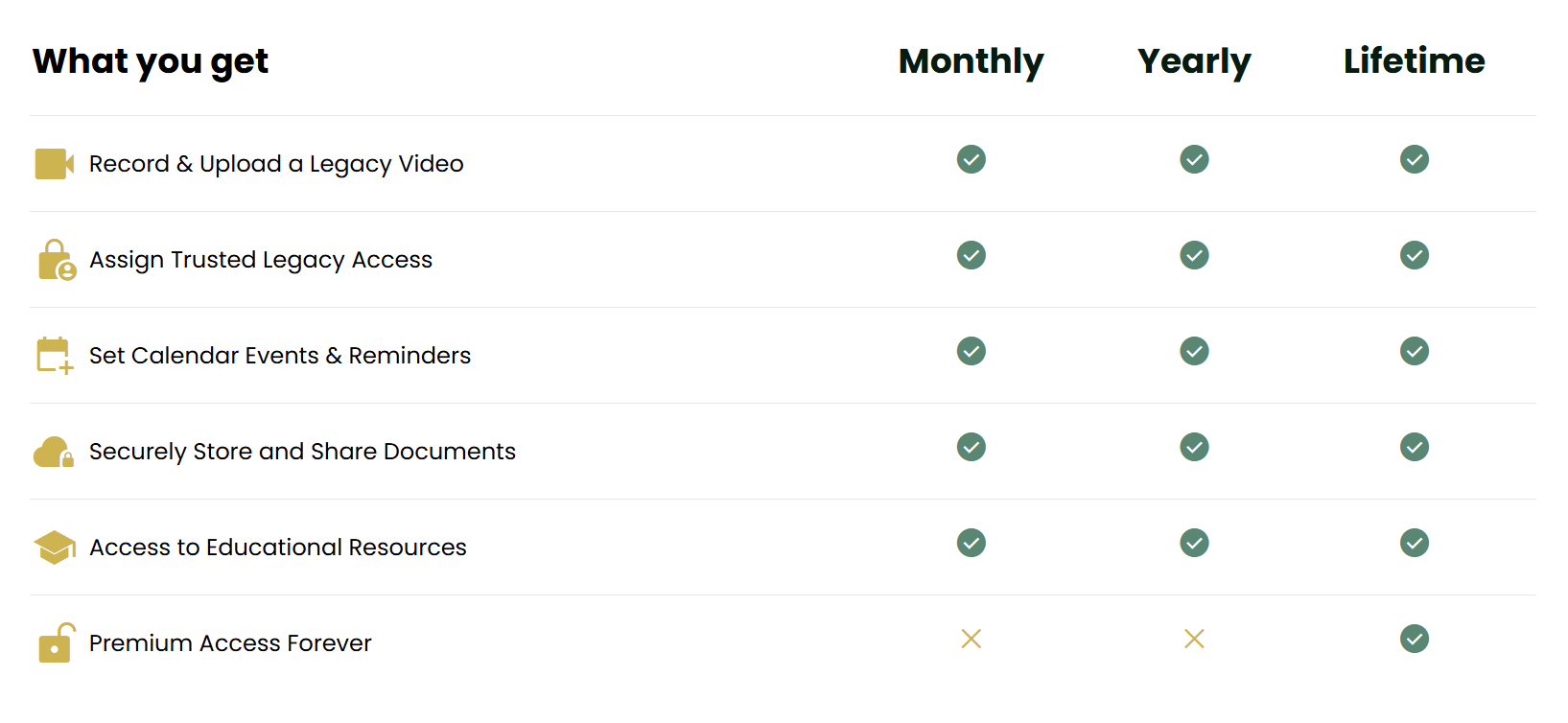 Our pricing is simple and transparent, with flexible plans to fit different needs and levels of access. All plans are built around security, ease of use, and meaningful features that help you prepare, plan, and preserve what matters most.